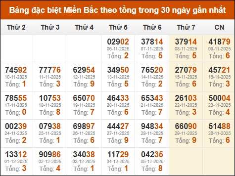 Thống kê GĐB XSMB theo tổng trong 30 ngày gần đây tính đến 06/12/2025
