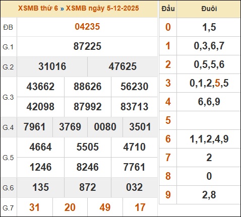 Thống kê XSMB hôm trước ngày 05/12/2025