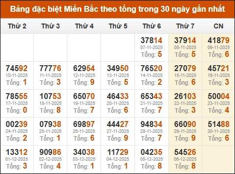 Thống kê GĐB xổ số miền Bắc theo tổng trong 30 ngày tính đến 07/12/2025