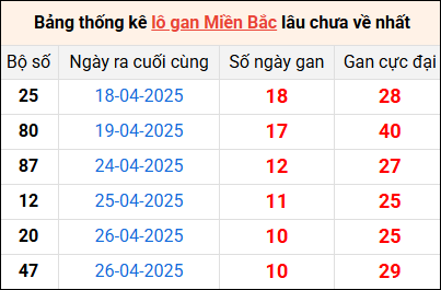 ⚡ Lô khan miền Bắc nhất: 25 - 80 - 87 - 12 - 20