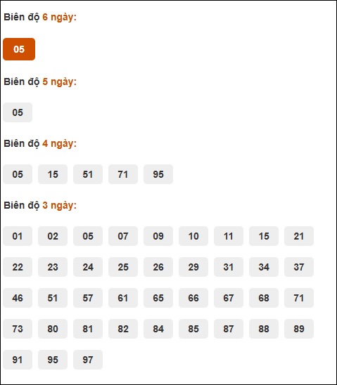 ⇒ Theo dõi thống kê trên, ta thấy chạm đề 6 lâu chưa ra nhất (bao gồm 19 cặp số có chứa số 6), và đã 23 ngày chưa xuất hiện.
