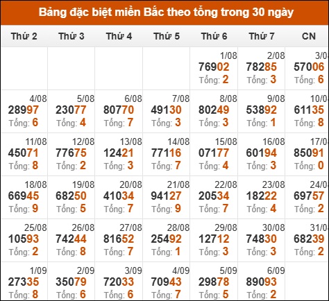 Thống kê GĐB xổ số miền Bắc theo tổng trong 30 ngày tính đến 07/09/2025