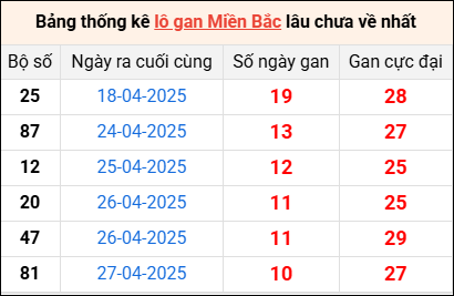 ⚡ Cặp số lâu ra MB nhất: 25 - 87 - 12 - 20 - 47
