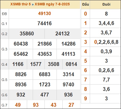 Bảng kết quả xổ số miền Bắc 07/08/2025 hôm qua
