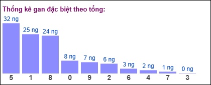 ⇒ Nhìn vào bảng thống kê gan ĐB theo tổng thì tổng 5 lâu chưa về nhất (bao gồm 10 cặp số: 05, 14, 23, 32, 41, 50, 69, 78, 87, 96) và đã 32 ngày chưa xuất hiện.