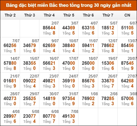 Thống kê giải đặc biệt theo tổng trong vòng 30 ngày tính đến 08/08/2025