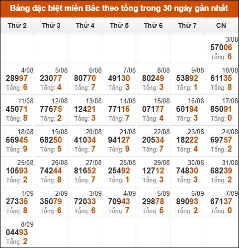 Thống kê GĐB miền Bắc theo tổng trong 30 ngày tính đến 09/09/2025