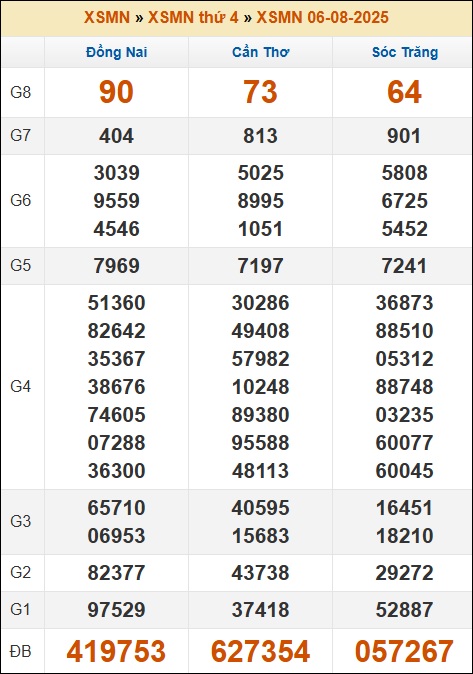 Kết quả xổ số Miền Nam ngày 6/8/2025 thứ 4 tuần trước