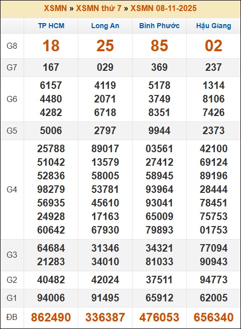 Kết quả xổ số Miền Nam 08/11/2025 thứ 7 tuần trước