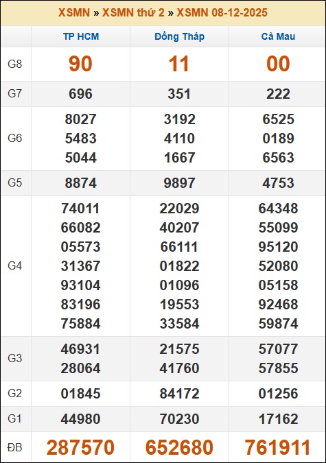 Kết quả xổ số Miền Nam 08/12/2025 thứ 2 tuần trước