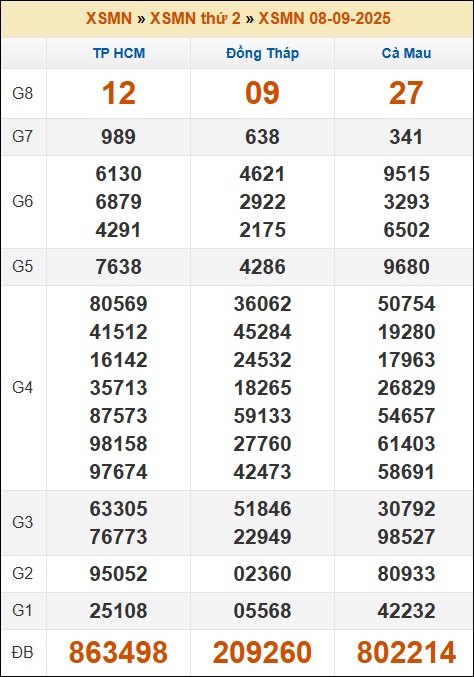 Kết quả xổ số Miền Nam 8/9/2025 thứ 2 tuần trước