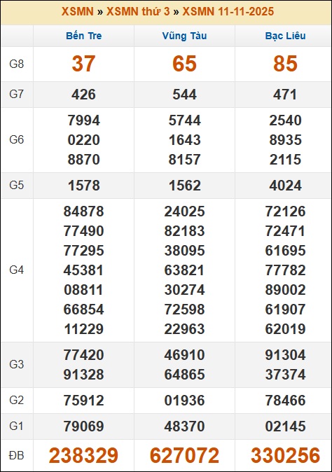 Kết quả xổ số Miền Nam 11/11/2025 thứ 3 tuần trước