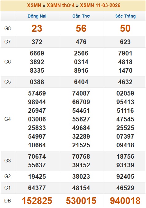 Kết quả xổ số Miền Nam ngày 11/03/2026 thứ 4 tuần trước