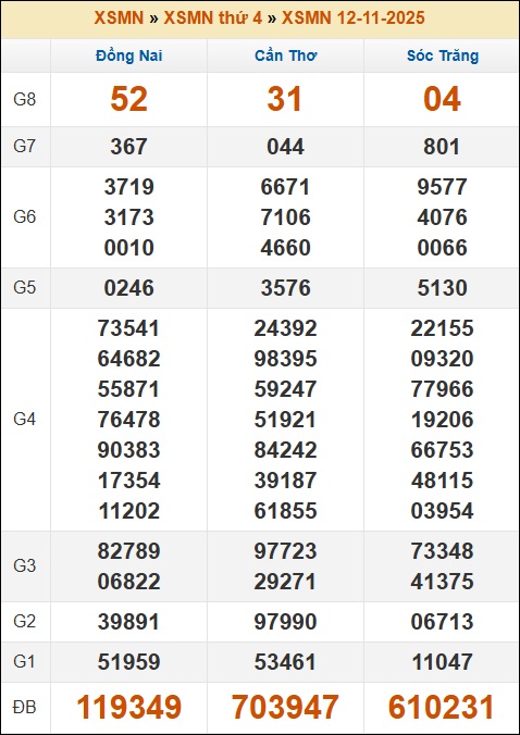 Kết quả xổ số Miền Nam ngày 12/11/2025 thứ 4 tuần trước