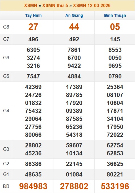 Kết quả xổ số Miền Nam 12/03/2026 thứ 5 tuần trước