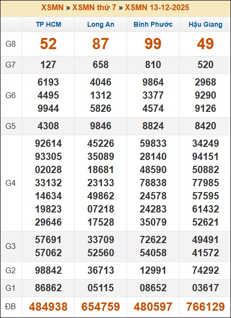 Kết quả xổ số Miền Nam 13/12/2025 thứ 7 tuần trước