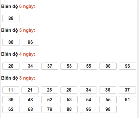 Đuôi 9: 13 ngày, Đuôi 2: 3 ngày, Đuôi 4: 3 ngày, Đuôi 8: 2 ngày, Đuôi 1: 1 ngày