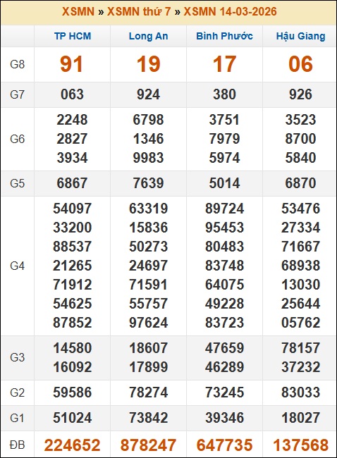 Kết quả xổ số Miền Nam 14/03/2026 thứ 7 tuần trước