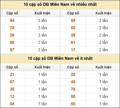 ⚡ 10 cặp số ĐB Miền Nam về nhiều nhất/ ít nhất tính đến ngày 21/04/2026: