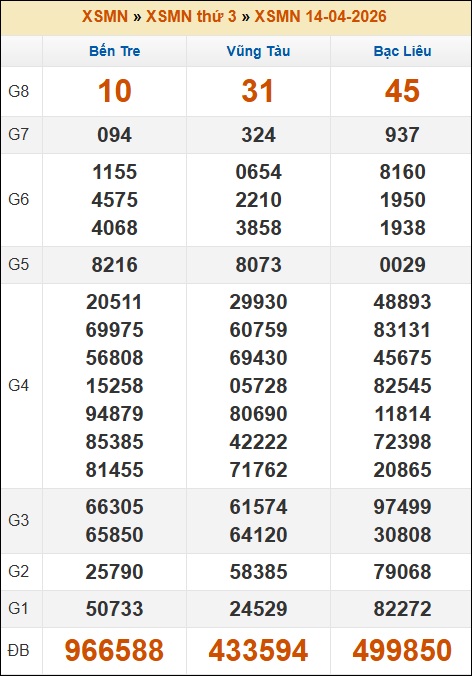 Kết quả xổ số Miền Nam 14/04/2026 thứ 3 tuần trước