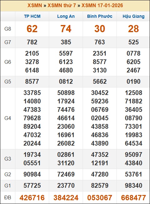 Kết quả xổ số Miền Nam 17/01/2026 thứ 7 tuần trước