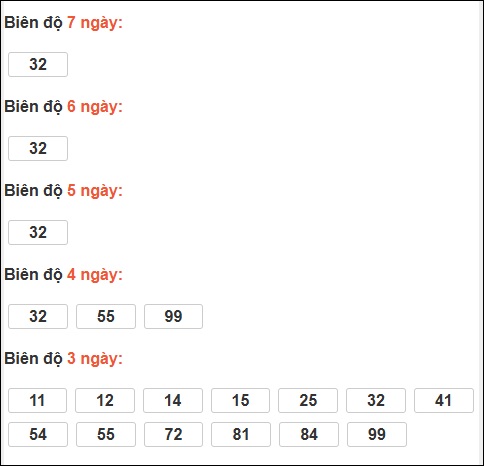 Đuôi 5: 5 ngày, Đuôi 3: 4 ngày, Đuôi 1: 2 ngày, Đuôi 8: 2 ngày, Đuôi 2: 1 ngày