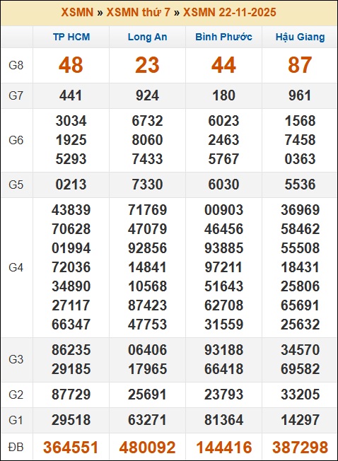 Kết quả xổ số Miền Nam 22/11/2025 thứ 7 tuần trước