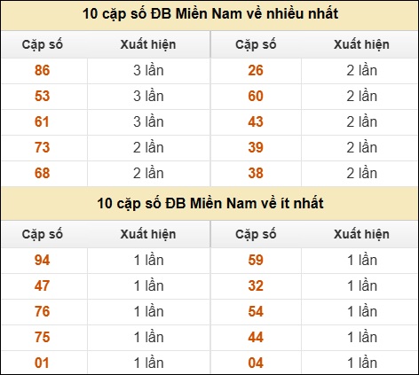 ⚡ 10 cặp số ĐB Miền Nam về nhiều nhất/ ít nhất tính đến ngày 3/9/2025:
