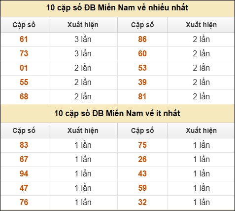 ⚡ 10 cặp số ĐB Miền Nam về nhiều nhất/ ít nhất tính đến ngày 30/7/2025: