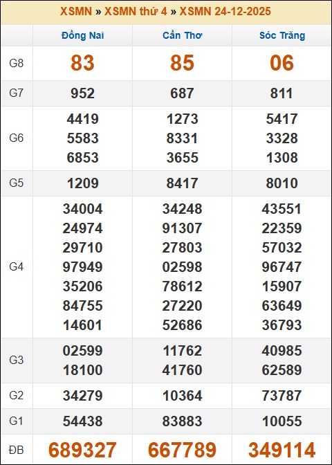 Kết quả xổ số Miền Nam ngày 24/12/2025 thứ 4 tuần trước