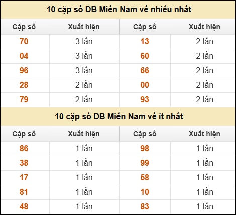 ⚡ 10 cặp số ĐB Miền Nam về nhiều nhất/ ít nhất tính đến ngày 04/11/2025: