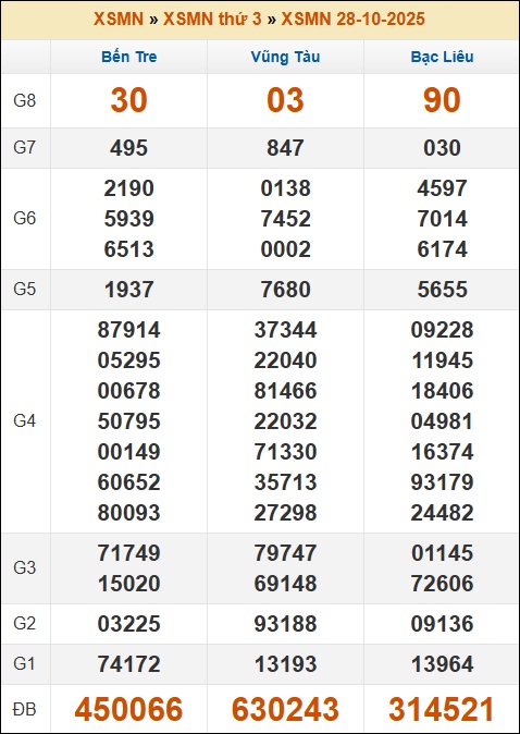 Kết quả xổ số Miền Nam 28/10/2025 thứ 3 tuần trước
