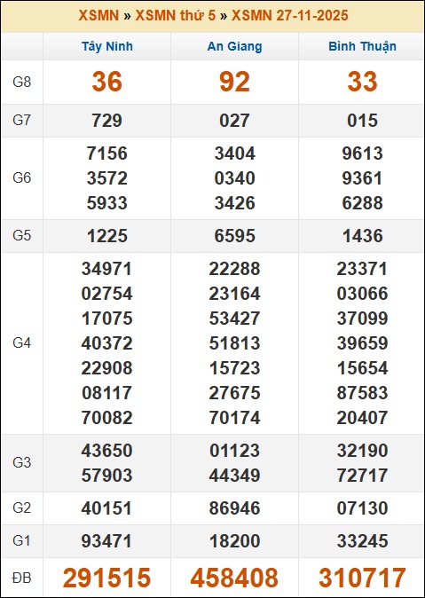 Kết quả xổ số Miền Nam 27/11/2025 thứ 5 tuần trước