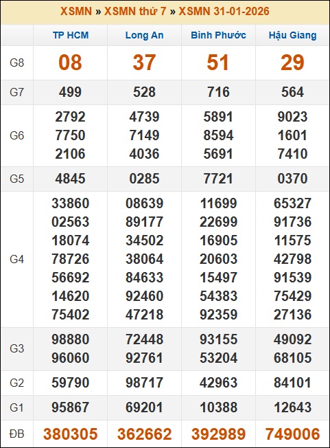 Kết quả xổ số Miền Nam 31/01/2026 thứ 7 tuần trước