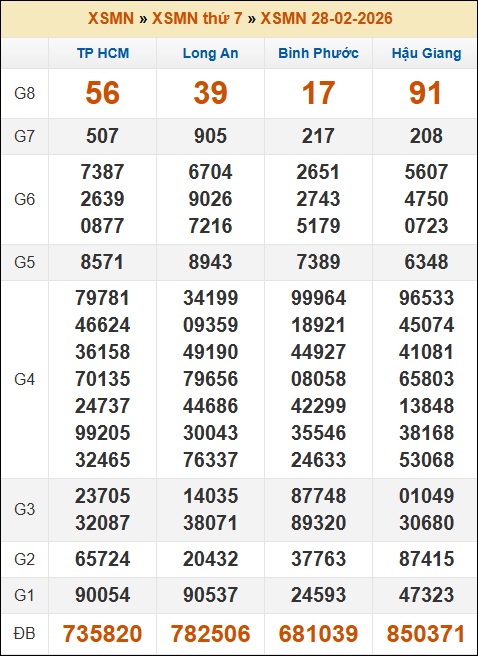 Kết quả xổ số Miền Nam 28/02/2026 thứ 7 tuần trước