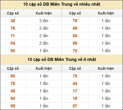 ⚡ 10 cặp số ĐB XSMT về nhiều nhất/ ít nhất tính dến ngày 10/03/2026:
