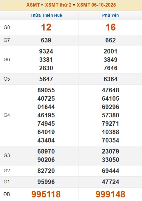 Kết quả xổ số Miền Trung 06/10/2025 thứ 2 tuần trước