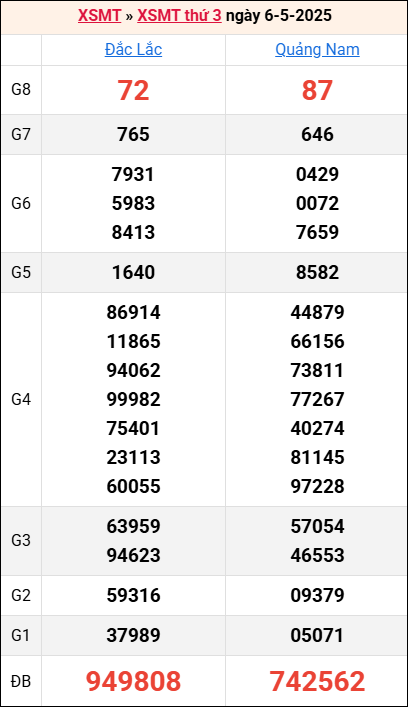 Bảng kết quả kỳ trước 6/5/2025