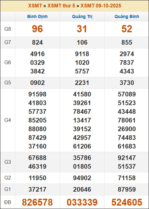 Kết quả xổ số Miền Trung 09/10/2025 thứ 5 tuần trước