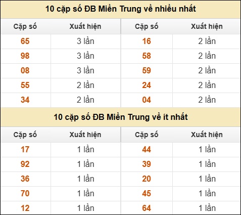 ⚡ 10 cặp số ĐB XSMT về nhiều nhất/ ít nhất tính đến ngày 16/04/2026: