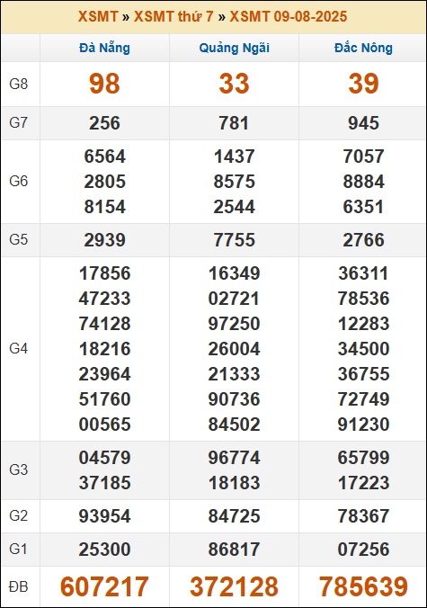 Kết quả xổ số Miền Trung 09/08/2025 thứ 7 tuần trước