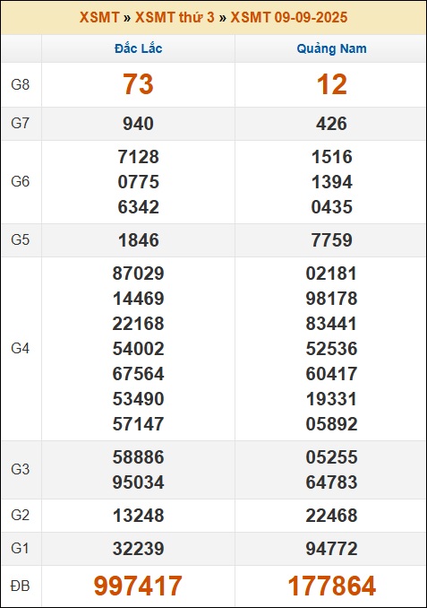 Kết quả xổ số Miền Trung 9/9/2025 thứ 3 tuần trước