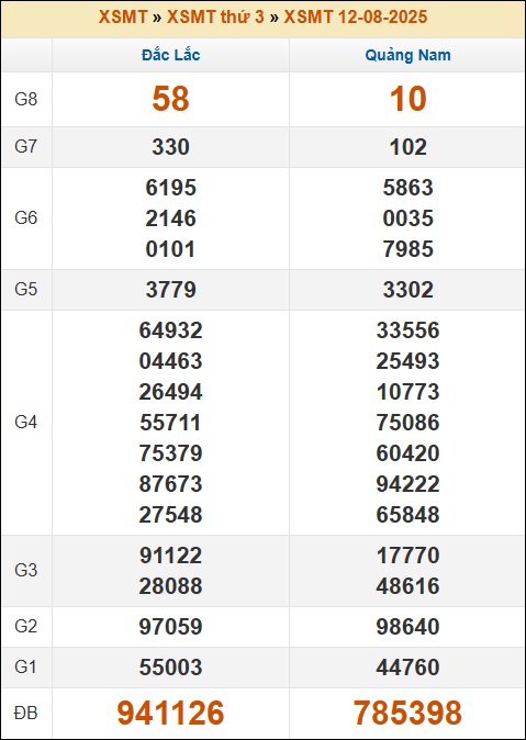 Kết quả xổ số Miền Trung 12/08/2025 thứ 3 tuần trước