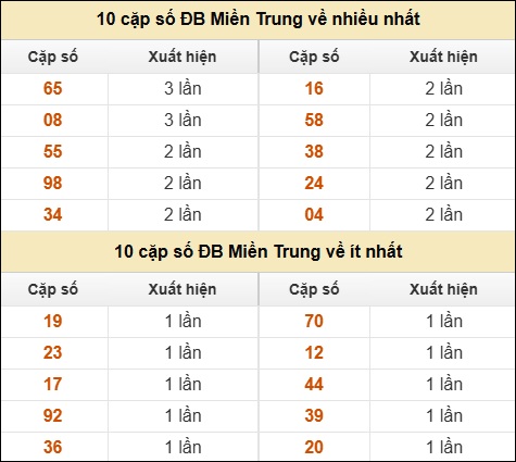 ⚡ 10 cặp số ĐB XSMT về nhiều nhất/ ít nhất tính đến ngày 02/04/2026: