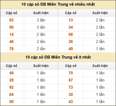 ⚡ 10 cặp số ĐB XSMT về nhiều nhất/ ít nhất tính dến ngày 21/11/2025: