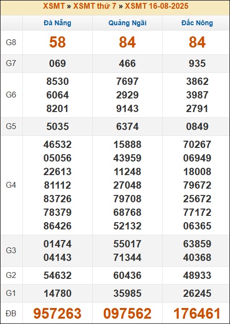 Kết quả xổ số Miền Trung 16/08/2025 thứ 7 tuần trước