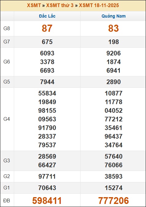 Kết quả xổ số Miền Trung 18/11/2025 thứ 3 tuần trước