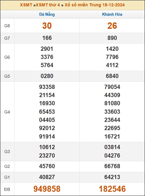 Kết quả xổ số Miền Trung 18/12/2024 thứ 4 tuần trước