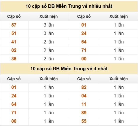 ⚡ 10 cặp số ĐB XSMT về nhiều nhất/ ít nhất tính dến ngày 25/03/2026: