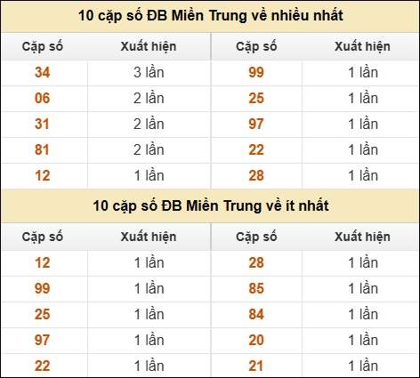 ⚡ 10 cặp số ĐB XSMT về nhiều nhất/ ít nhất tính dến ngày 29/10/2025: